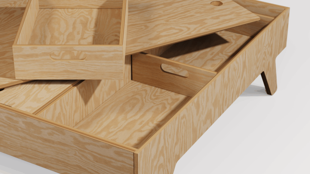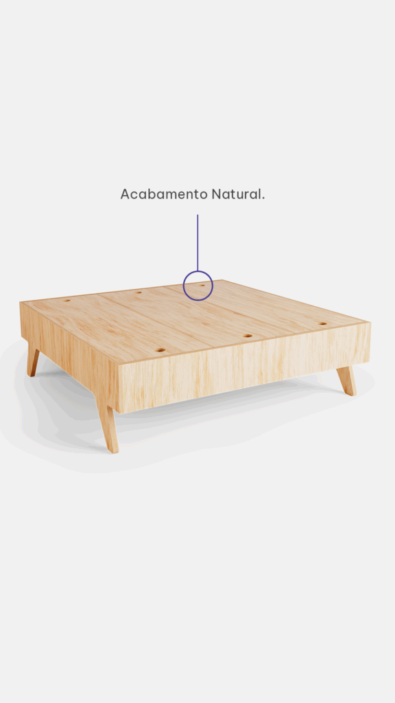Além de mesa de centro, a MESA ARMAZENAGEM conta com tampo removível, revelando nichos para organização de objetos.