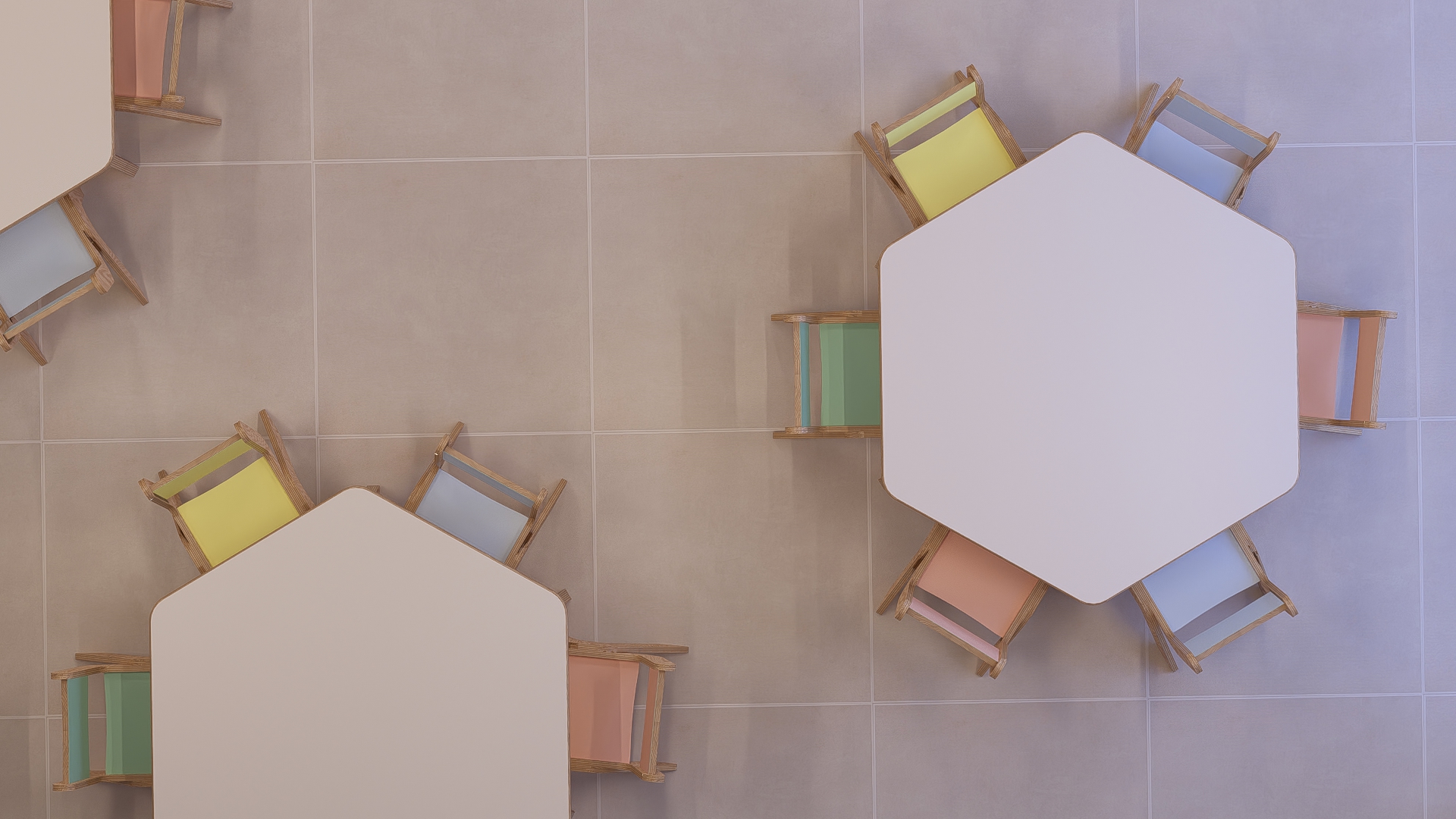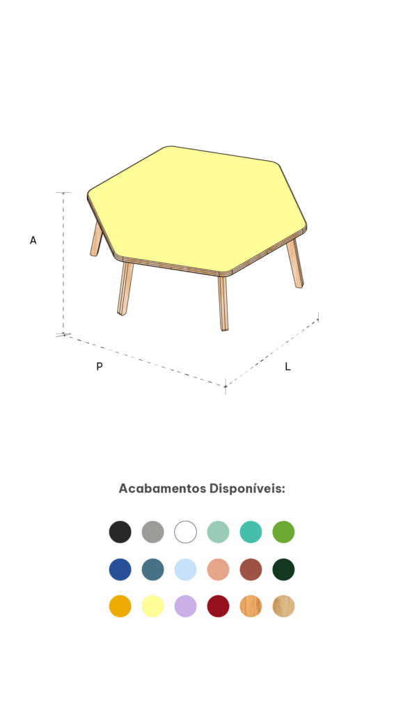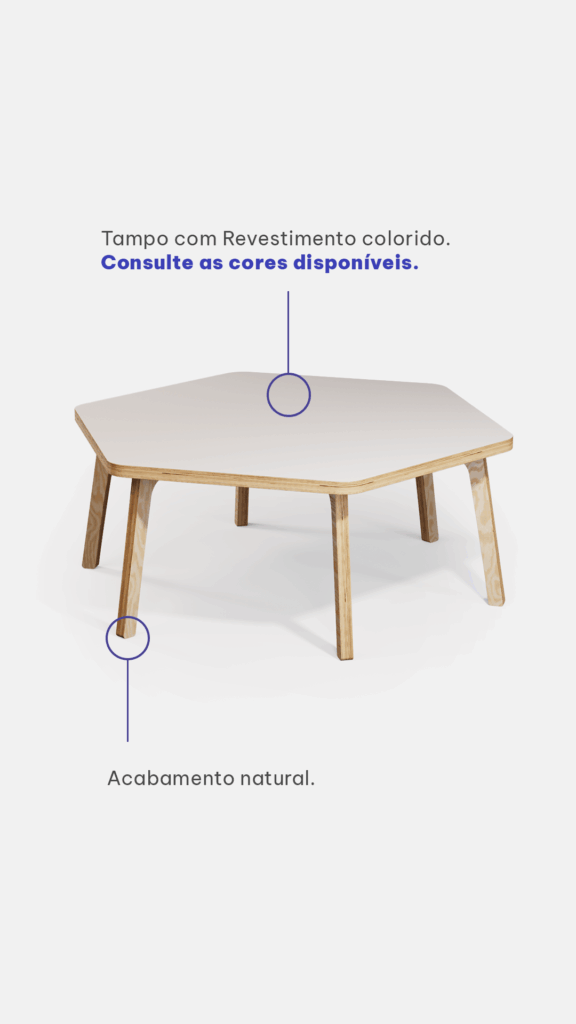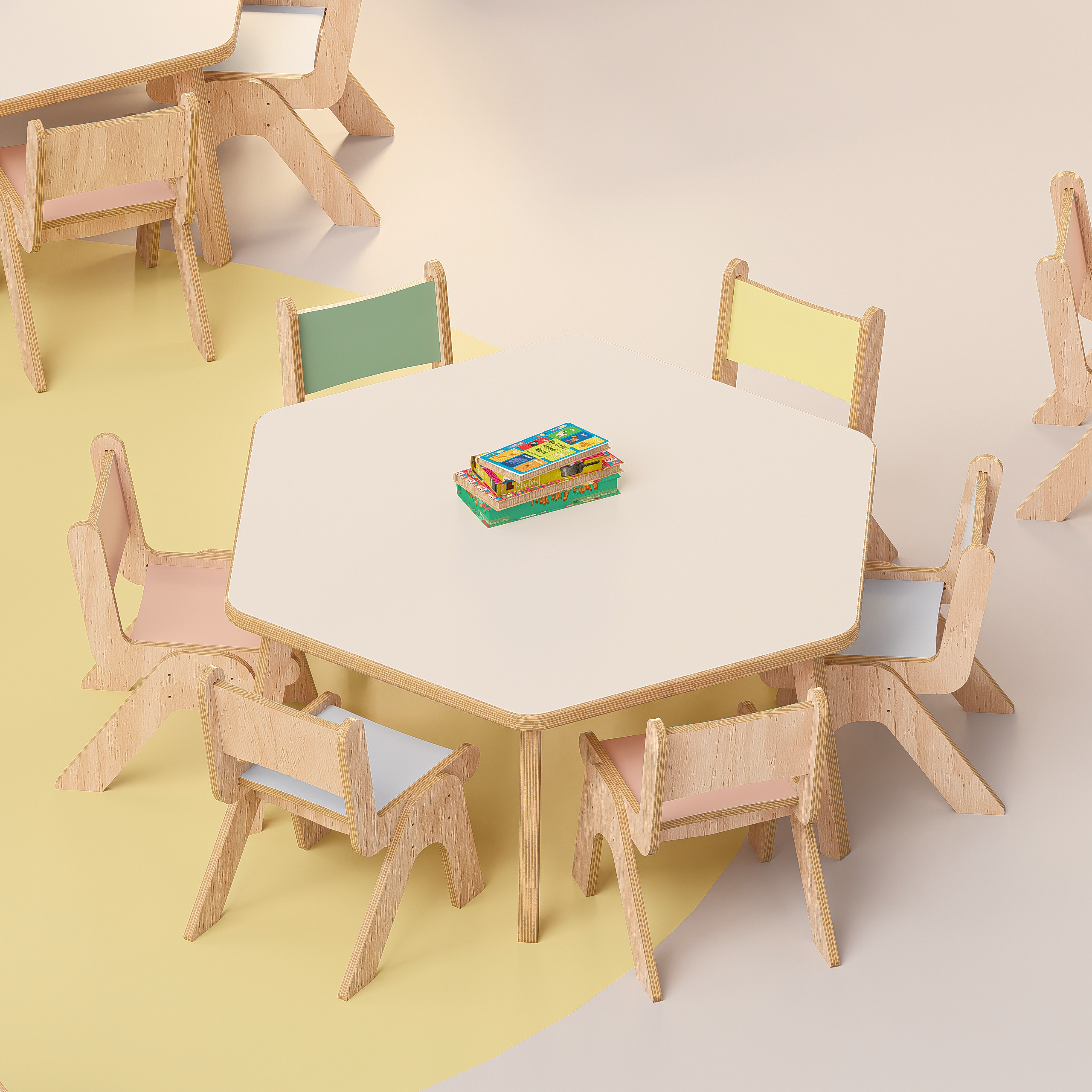 MANDURÍ transforma o aprendizado em uma experiência coletiva natural. Seus seis lados iguais criam um equilíbrio perfeito entre simetria e versatilidade, onde cada criança tem seu espaço, mas todas compartilham o centro.