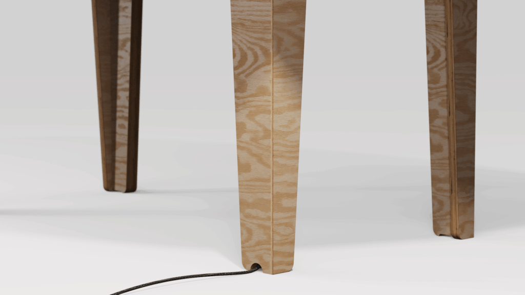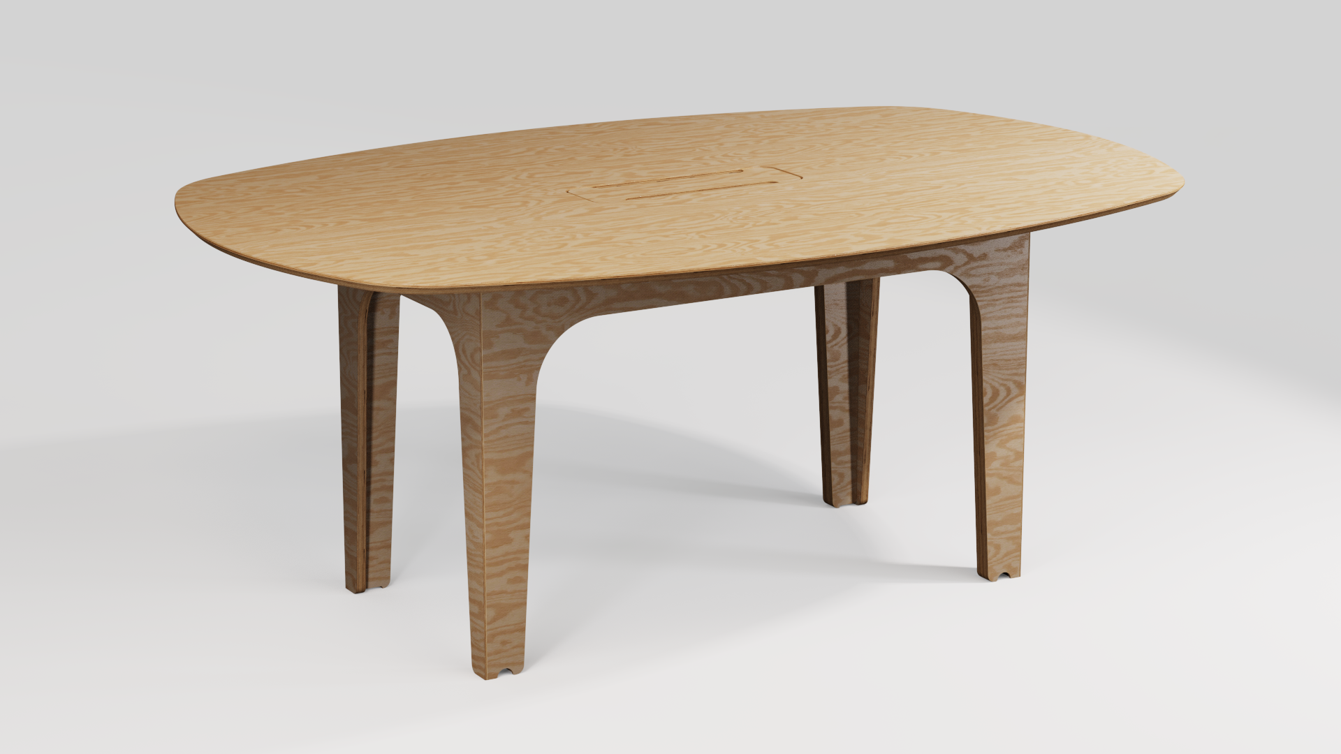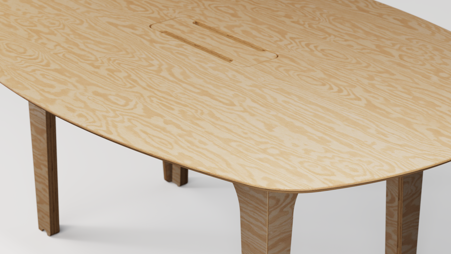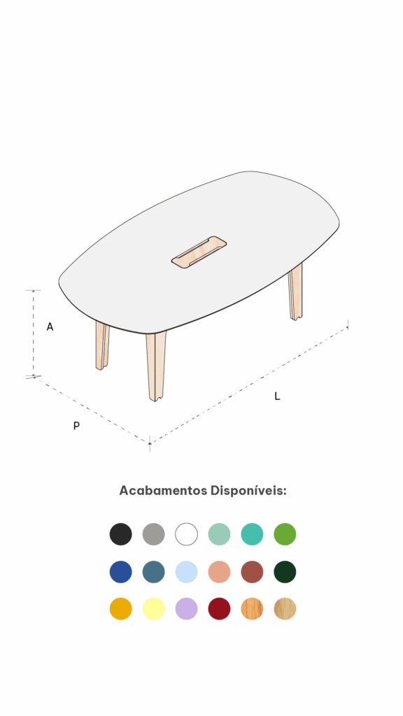 MESA PRANCHA acomoda até 10 pessoas e serve para reuniões, trabalho ou refeições. Possui caminhos internos para conduzir a fiação de energia e dados de maneira invisível.
