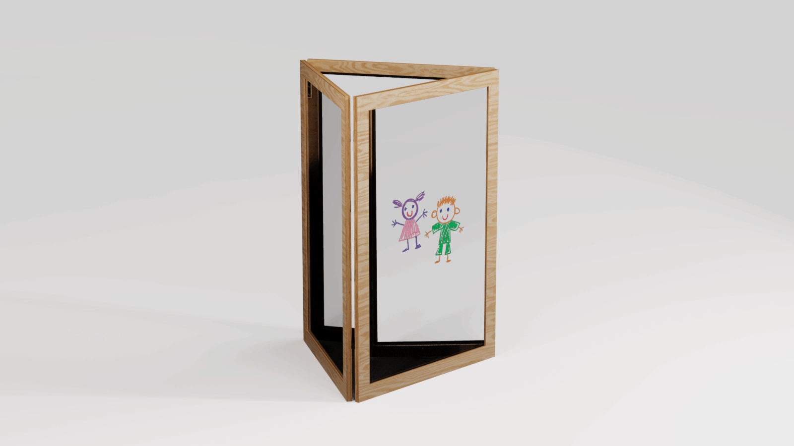 A TELA BIOMBO permite que duas crianças desenhem ao mesmo tempo na mesma tela transparente, uma de cado lado, estimulando o trabalho em equipe. Também pode ser usada como divisor de ambientes e como expositor de trabalhos.